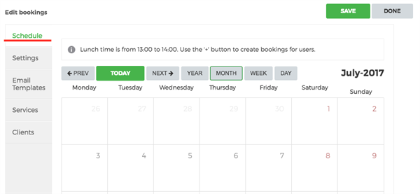 6. Schedule Under this section you'll see an interactive calendar for administration purposes. Here you'll have the option to check all the bookings and also create, edit or even cancel a booking directly from the website.